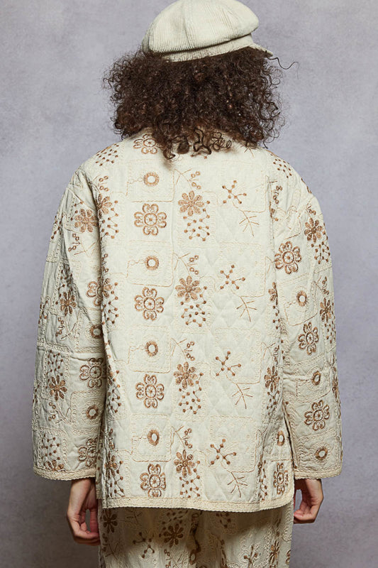 The POL Quilted Jacket combines sophisticated design with comfort. Featuring a flattering V-neck and long sleeves, its roomy fit ensures easy layering. Crafted from a quilted woven fabric, it showcases delicate floral embroidery enhanced by contrast border piping, adding refined detail to your outerwear collection. This jacket balances elegance with practicality for a polished yet comfortable look.